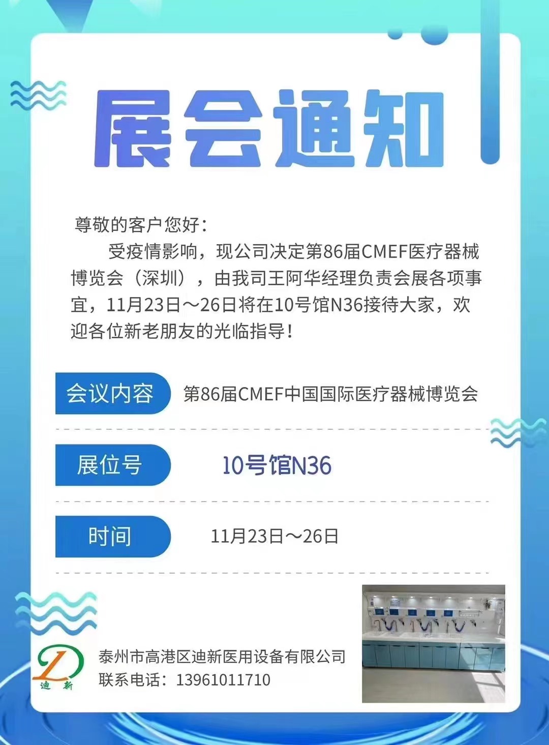 尊敬的客戶您好:         受疫情影響,現(xiàn)公司決定第86屆CMEF醫(yī)療器械博覽會(深圳),由我司王阿華經(jīng)理負責(zé)會展各項事宜,11月23日~26日將在10號館N36接待大家,歡迎各位新老朋友的光臨指導(dǎo)!......